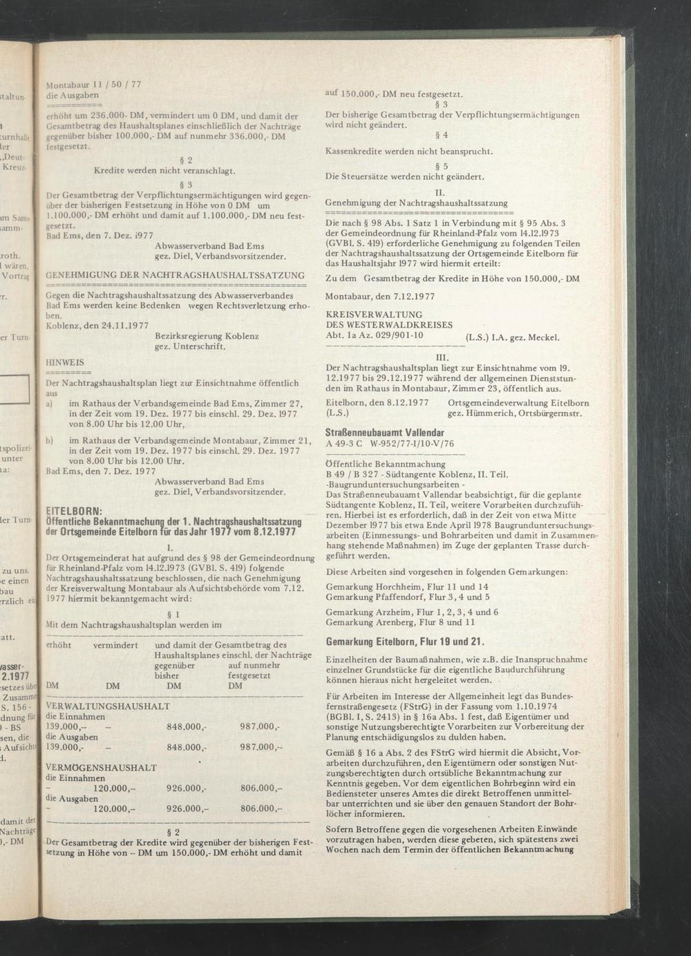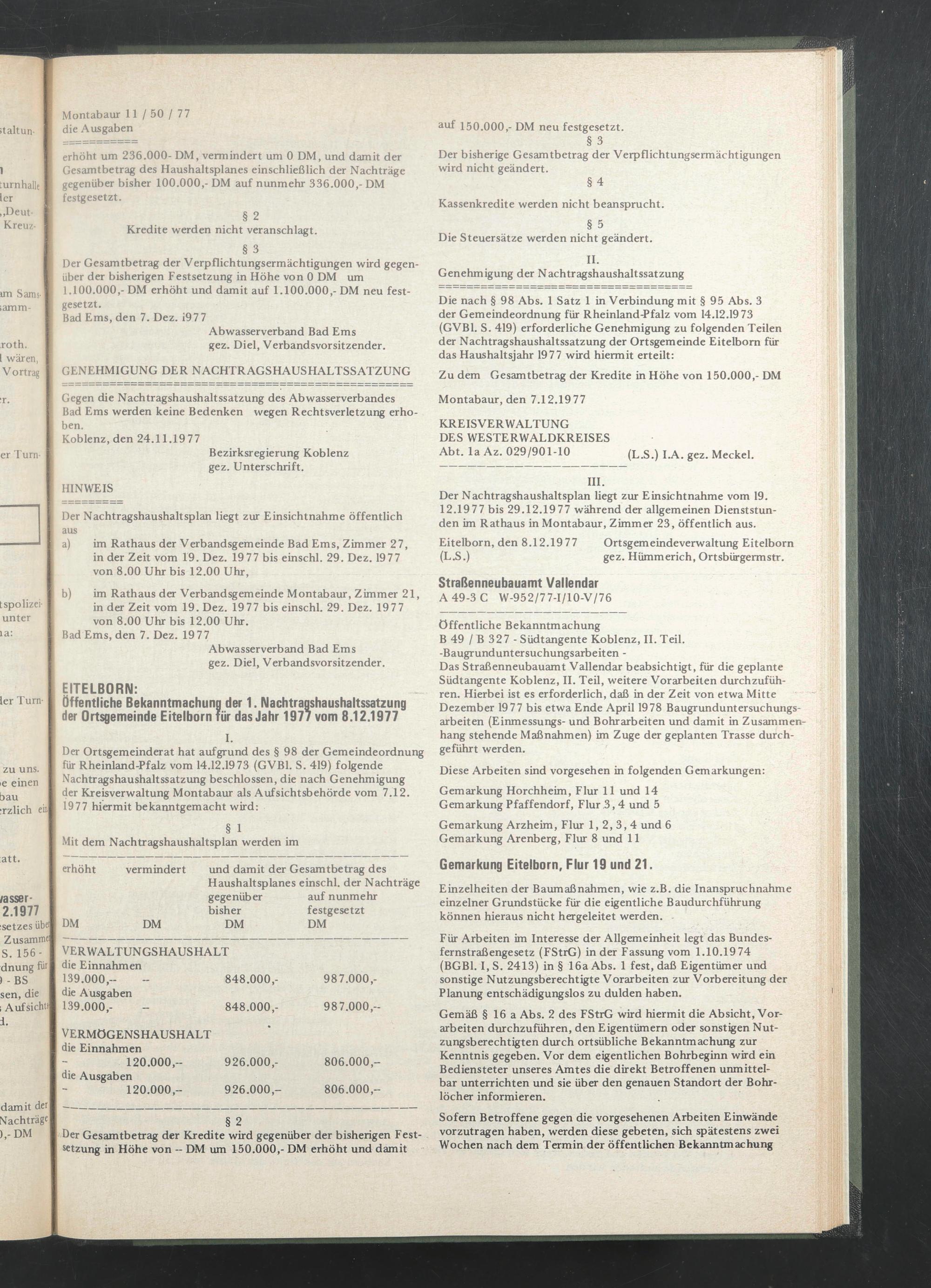 Die nach § 98 Abs. 1 Satz 1 in Verbindung mit § 95 Abs. 3 der Gemeindeordnung für Rheinland-Pfalz vom 14.12.1973 (GVB1. S. 419) erforderliche Genehmigung zu folgenden Teilen der Nachtragshaushaltssatzung der Ortsgemeinde Eitelbom für das Haushaltsjahr 1977 wird hiermit erteilt: