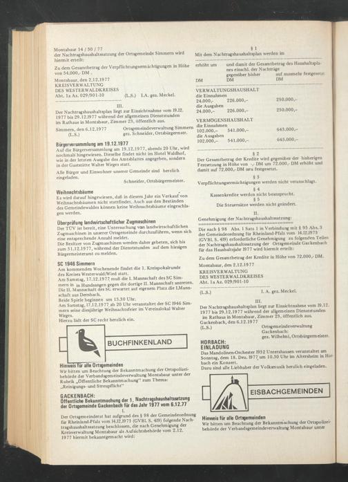 Der Nachtragshaushaltsplan liegt zur Einsichtnahme vom 19.12. 1977 bis 29.12.1977 während der allgemeinen Dienststunden im Rathaus in Montabaur, Zimmer 23, öffentlich aus. Gackenbach, den 6.12.19 77