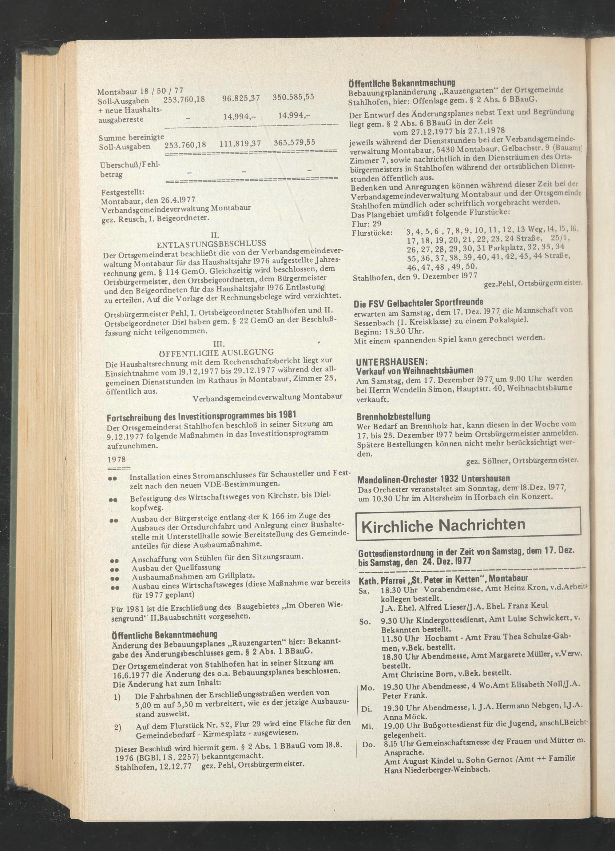 Der Ortsgemeinderat beschließt die von der Verbandsgemeindeverwaltung Montabaur für das Haushaltsjahr 1976 aufgestellte Jahresrechnung gern. § 114 GemO. Gleichzeitig wird beschlossen, dem Ortsbürgermeister, den Ortsbeigeordneten, dem Bürgermeister und den Beigeordneten für das Haushaltsjahr 1976 Entlastung zu erteilen. Auf die Vorlage der Rechnungsbelege wird verzichtet.