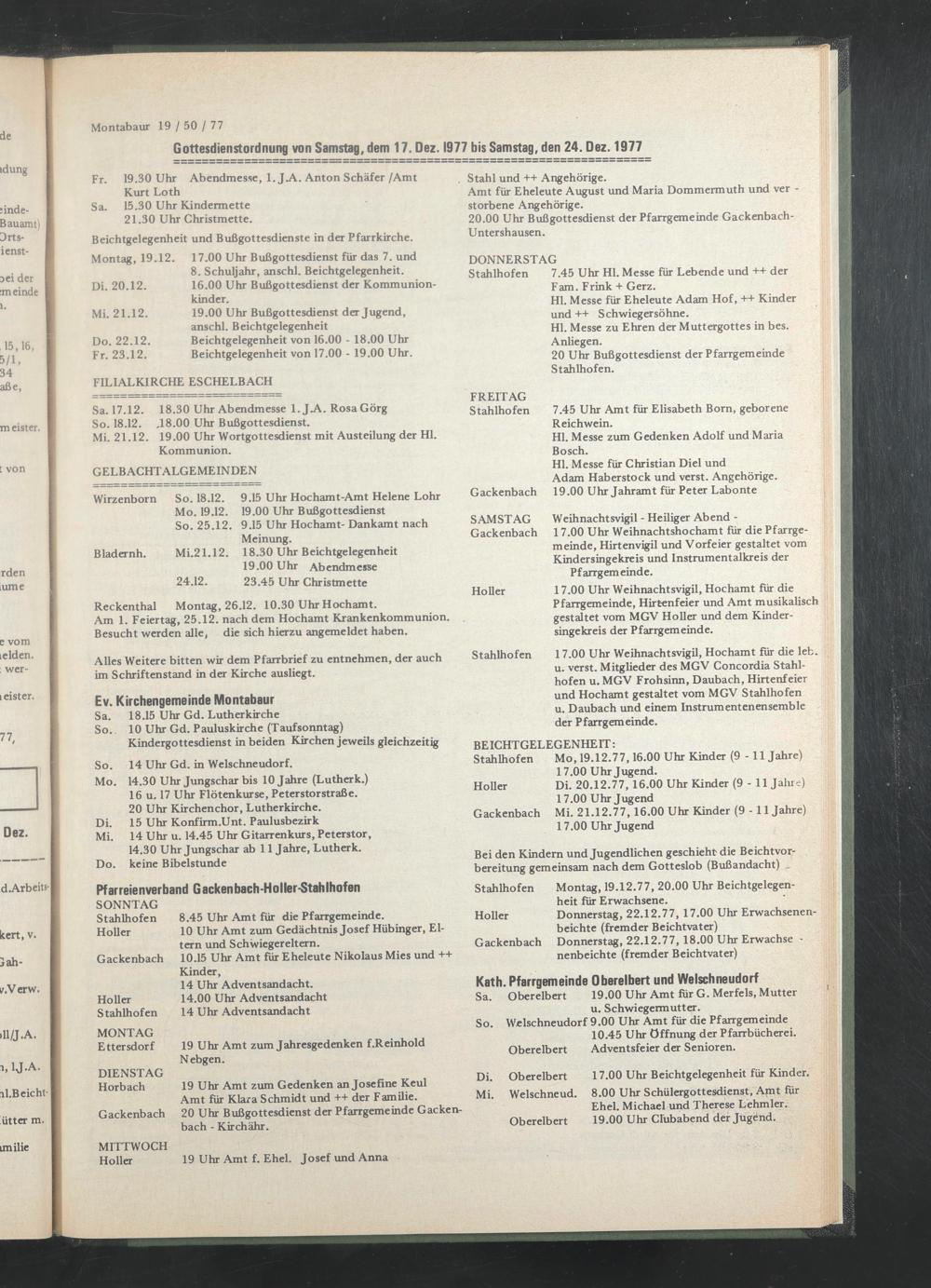 Stahlhofen Montag, 19.12.77, 20.00 Uhr Beichtgelegenheit für Erwachsene.