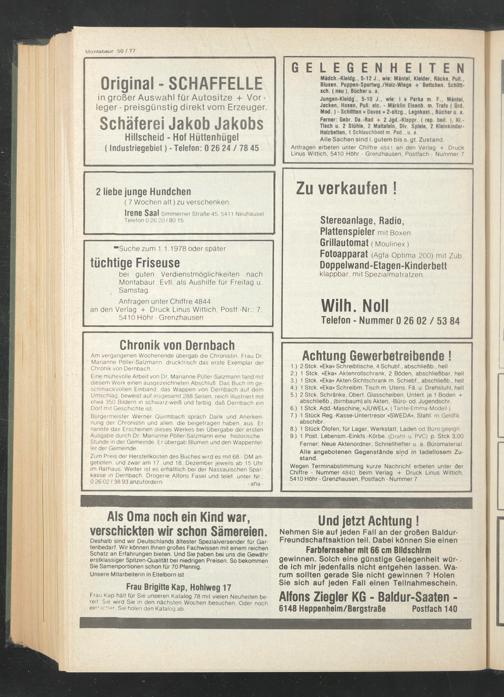Zum Preis der Plerstellkosten des Buches wird es mit 68.- DM an- geboten, und zwar am 17. und 18. Dezember jeweils ab 15 Uhr im Rathaus. Weiter ist es erhältlich bei der Nassauischen Sparkasse in Dernbach Drogerie Alfons Fasel und telef. unter Nr.: 0 26 02 / 38 93 anzufordern. -aha-