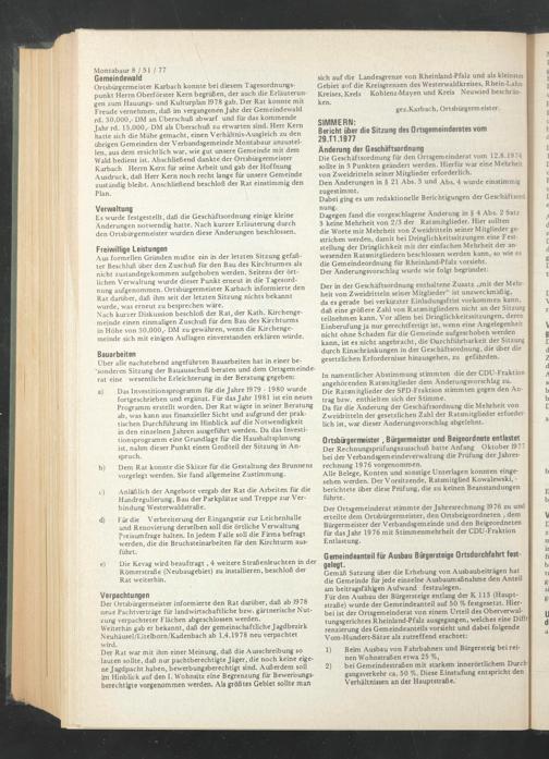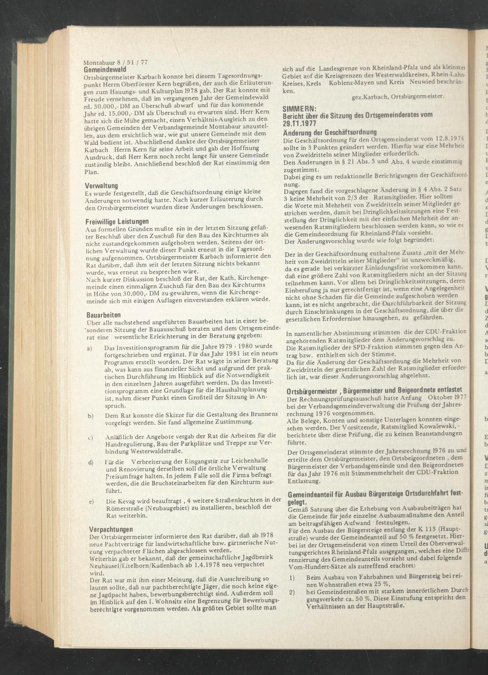 Der Ortsgemeinderat stimmte der Jahresrechnung 1976 zu und erteilte dem Ortsbürgermeister, den Ortsbeigeordneten , dem Bürgermeister der Verbandsgemeinde und den Beigeordneten für das Jahr 1976 mit Stimmenmehrheit der CDU-Fraktion Entlastung.