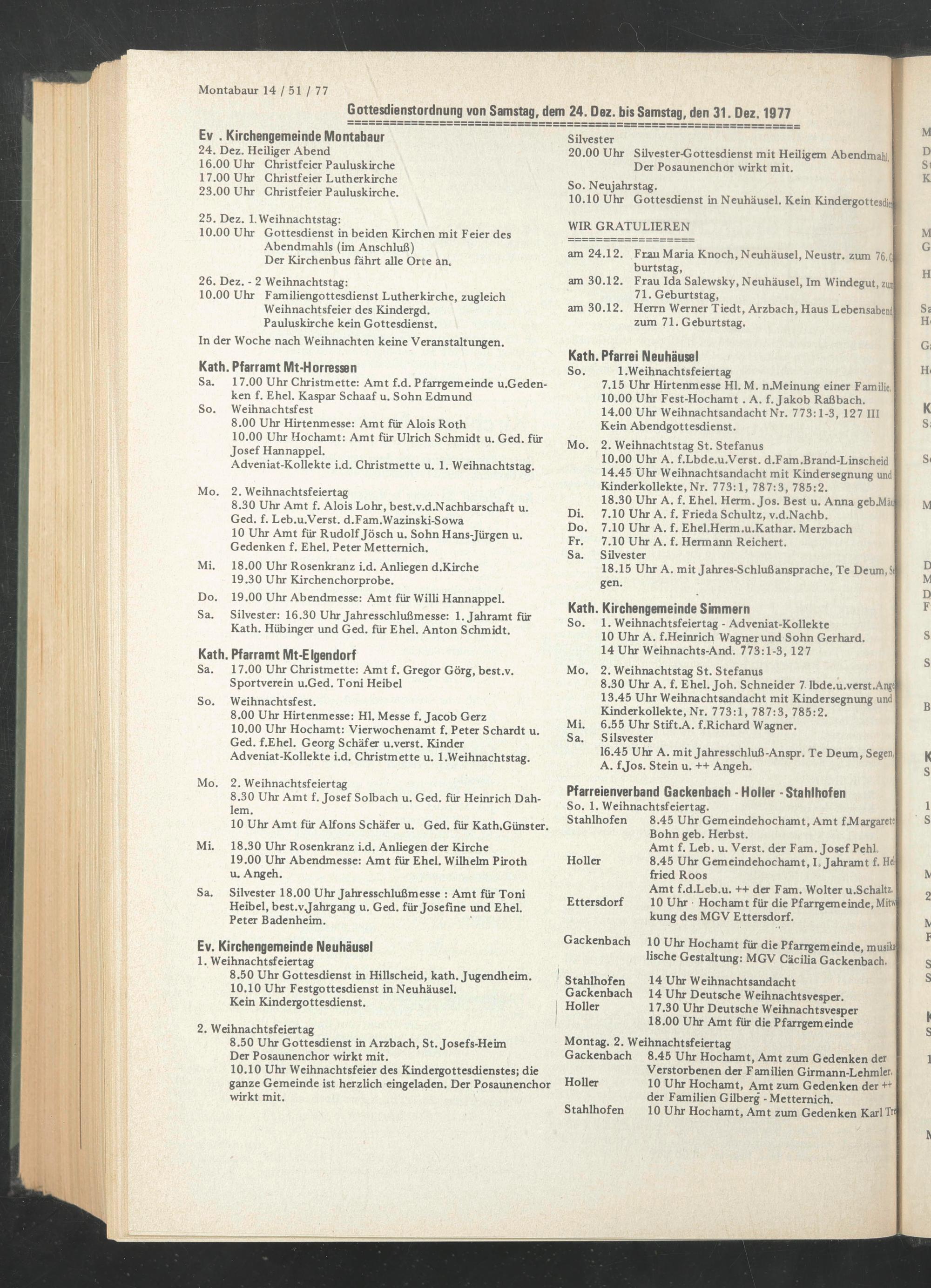Gottesdienstordnung von Samstag, dem 24. Dez. bis Samstag, den 31. Dez. 1977