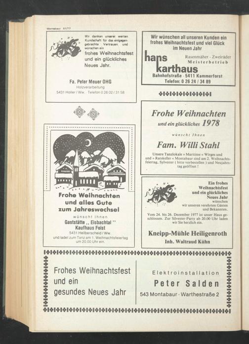 Vom 24. bis 26. Dezember 1977 ist unser Haus geschlossen. Zur Silvester-Party ab 20.00 Uhr laden wir Sie herzlich ein.