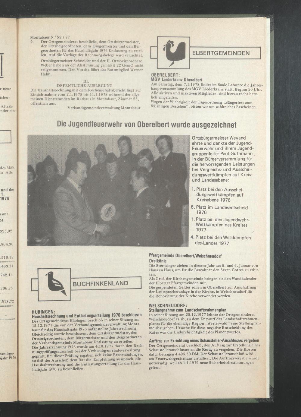 Der Ortsgemeinderat Hübingen beschloß in seiner Sitzung am 15.12.1977 die von der Verbandsgemeindeverwaltung Montabaur für das Haushaltsjahr 1976 aufgestellte Jahresrechnung. Gleichzeitig wurde beschlossen, dem Ortsbürgermeister, den Ortsbeigeordneten, dem Bürgermeister und den Beigeordneten der Verbandsgemeinde Montabaur Entlastung zu erteilen.