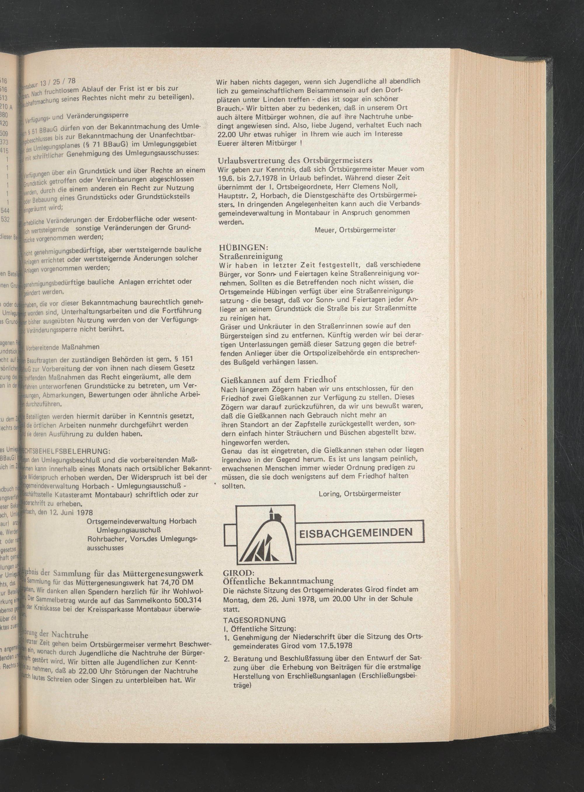 Urlaubsvertretung des Ortsbürgermeisters Wir geben zur Kenntnis, daß sich Ortsbürgermeister Meuer vom 19.6. bis 2.7.1978 in Urlaub befindet. Während dieser Zeit übernimmt der I. Ortsbeigeordnete, Herr Clemens Noll, Hauptstr. 2, Horbach, die Dienstgeschäfte des Ortsbürgermeisters. In dringenden Angelegenheiten kann auch die Verbandsgemeindeverwaltung in Montabaur in Anspruch genommen werden.