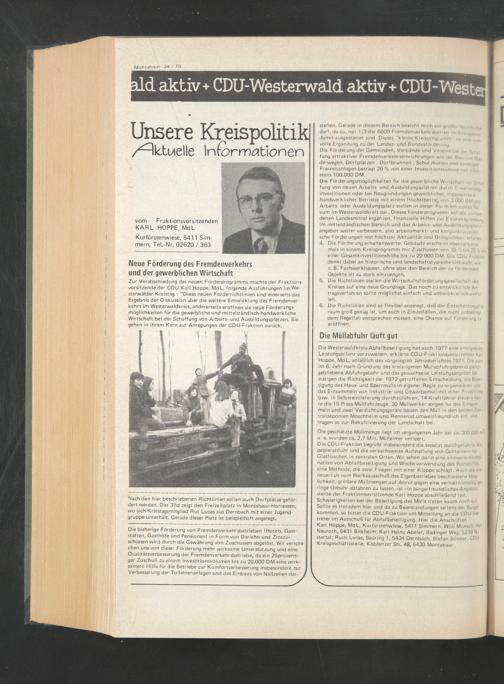 Die CDU-Fraktion begrüßt insbesondere die separat durchgefuhrte Altpapierabfuhr und die versuchsweise Aufstellung von Containern für Glasflaschen in zentralen Orten. Wir sehen darin eine sinnvolle Kombination von Abfallbeseitigung und Wiederverwendung des Rohstoffes, eine Methode, die zwei Fliegen mit einer Klappe schlägt. Auch die erst neuerlich vom Werksausschuß des Eigenbetriebes beschlossene Möglichkeit, größere Mullmengen auf Abruf gegen eine verhältnismäßig geringe Gebühr abfahren zu lassen, ist ein bürgerfreundliches Angebot, stellte der Fraktionsvorsitzende Karl Hoppe abschließend fest. Schwierigkeiten bei der Beseitigung des Mülls treten kaum noch auf. Sollte es trotzdem hier und da zu Beanstandungen seitens der Burger kommen, so bittet die CDU-Fraktion um Mitteilung an die CDU-Ver- treter im Ausschuß für Abfallbeseitigung. Hier die Anschriften Karl Hoppe, MdL, Kurfürstenwiese, 5411 Simmern; Willi Munsch, Hof Neuroth, 5431 Bilkheim; Karl Heinz Abeier, Büdinger Weg, 5239 Ni- stertal; Ruth Lucas, Südring 1, 5434 Dernbach, Stefan Stinner, CDU- Kreisgeschäftsstelle, Koblenzer Str. 48, 5430 Montabaur