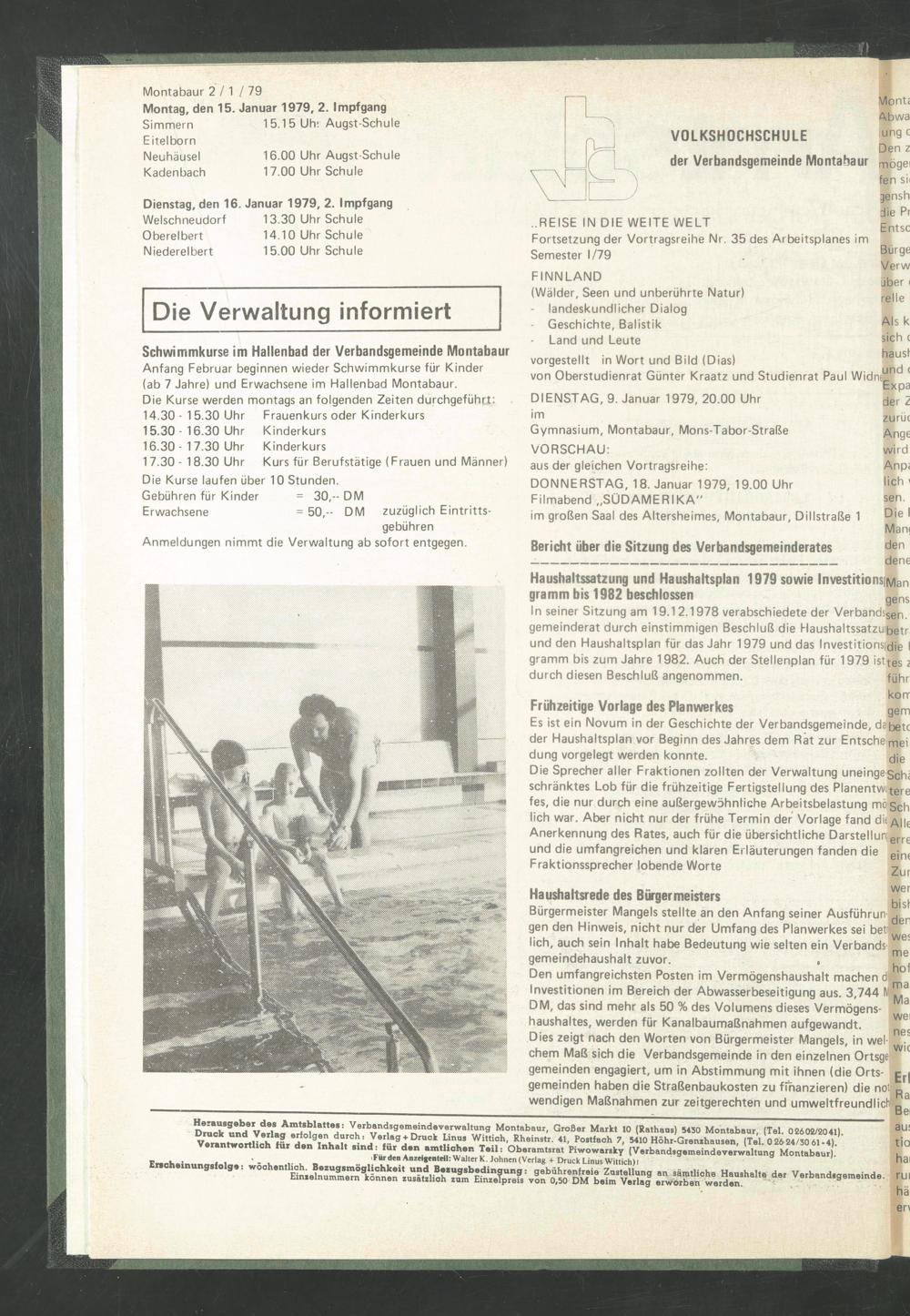 Druck und Verlag erfolgen durch: Verlag + Druck Linus Wittioh, Rheinstr. 41, Postfach 7, 5410 Höhr-Grenshausen, (Tel. 02624/30 61 - 4 ). Verantwortlich für den Inhalt sind: für den amtlichen Teil: Oberamtsrat Piwowarsky (Verbandsgemeindeverwaltung Montabaur).