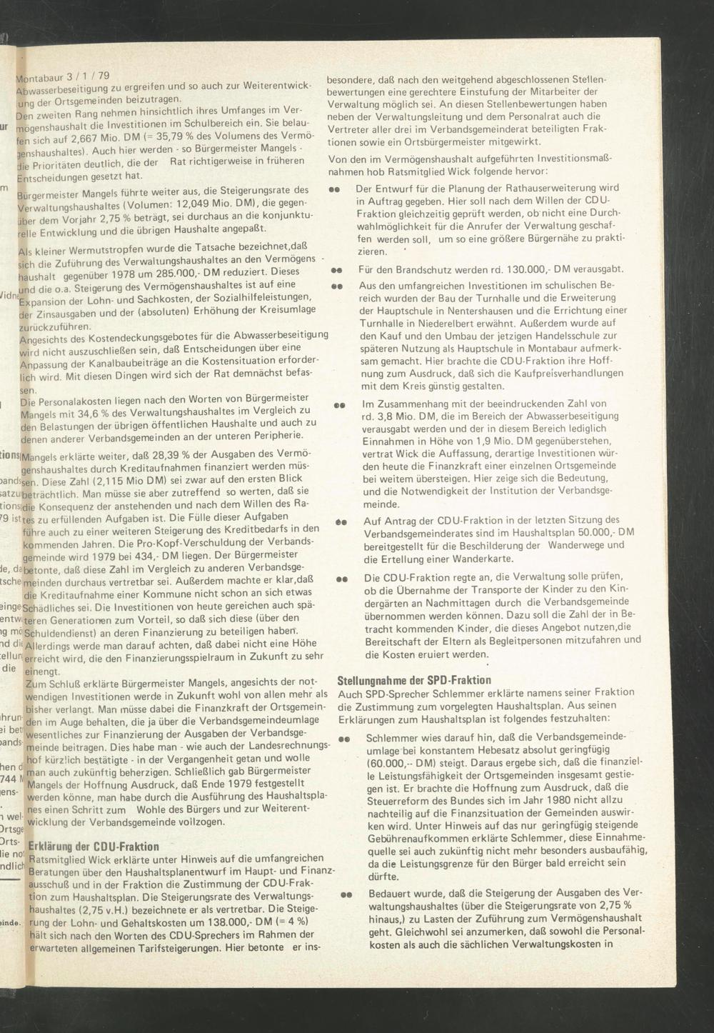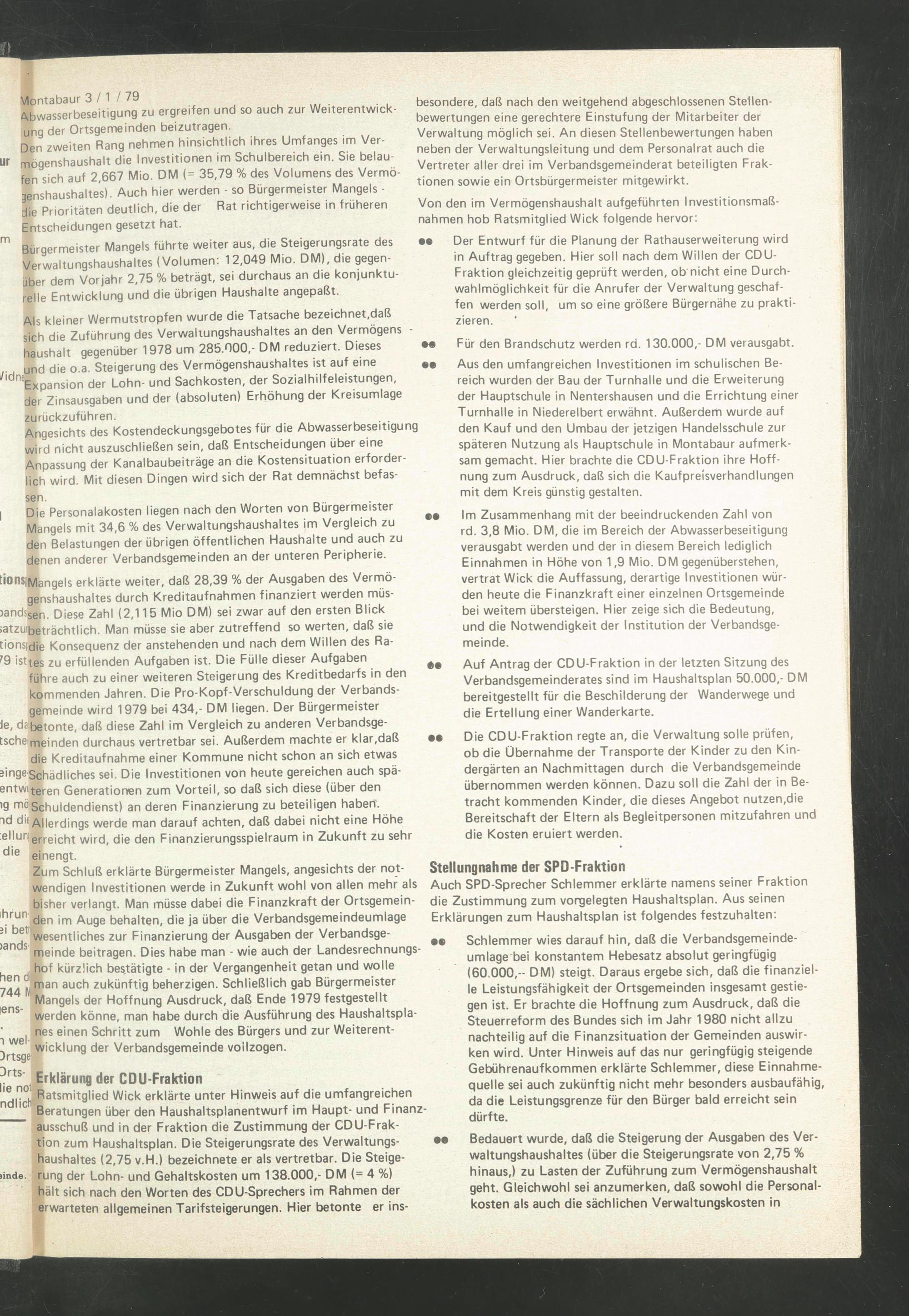 Als kleiner Wermutstropfen wurde die Tatsache bezeichnet.daß sich die Zuführung des Verwaltungshaushaltes an den Vermögens - haushalt gegenüber 1978 um 285.000,- DM reduziert. Dieses und die o.a. Steigerung des Vermögenshaushaltes ist auf eine ^Expansion der Lohn- und Sachkosten, der Sozialhilfeleistungen, der Zinsausgaben und der (absoluten) Erhöhung der Kreisumlage zurückzuführen.