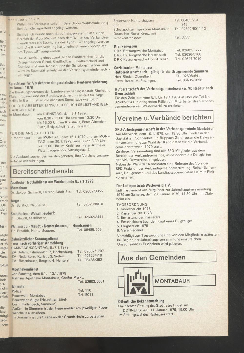 Für den Zeitraum vom 5.1. bis 12.1.1979 ist über die Tel.Nr. 02602/3541 in dringenden Fällen ein Mitarbeiter des Verbandsgemeindewerkes (Wasserwerk) zu erreichen.