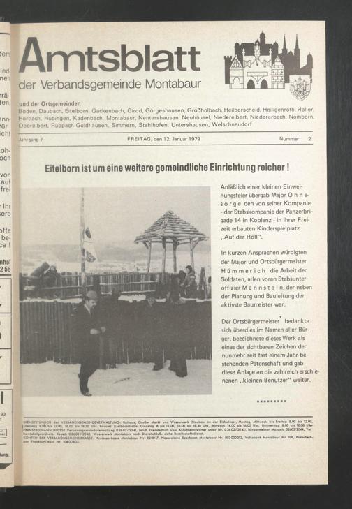 Anläßlich einer kleinen Einweihungsfeier übergab Major Ohnesorge den von seiner Kompanie - der Stabskompanie der Panzerbrigade 14 in Koblenz - in ihrer Freizeit erbauten Kinderspielplatz „Auf der Höll".