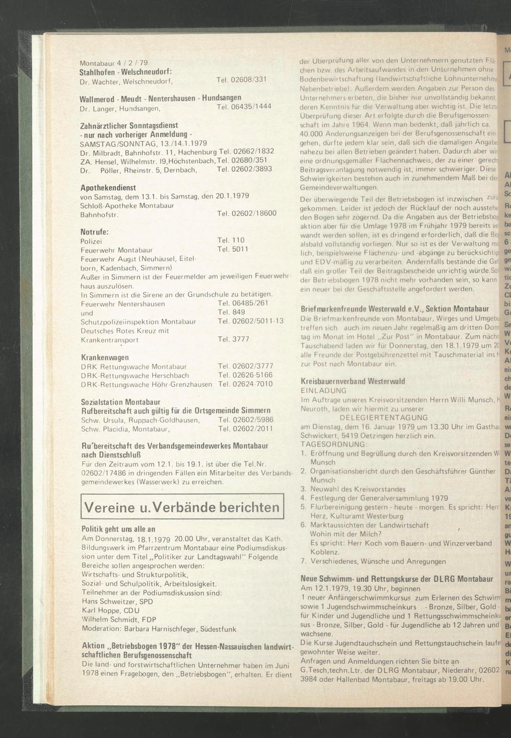 SAMSTAG/SONNTAG, 13./14.1.1979 Dr. Milbradt, Bahnhofstr. 11, Hachenburg Tel. 02662/1832 ZA. Hensel, Wilhelmstr. I9,Höchstenbach,Tel. 02680/351 Dr. Poller, Rheinstr. 5, Dernbach, Tel. 02602/3893