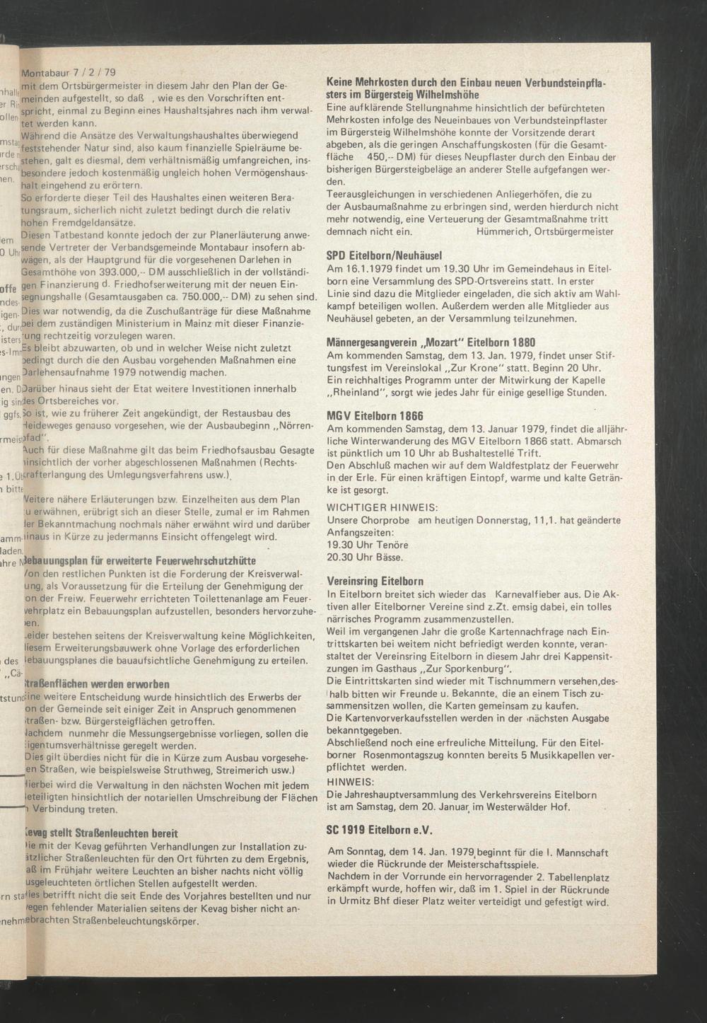 Am 16.1.1979 findet um 19.30 Uhr im Gemeindehaus in Eitelborn eine Versammlung des SPD-Ortsvereins statt. In erster Linie sind dazu die Mitglieder eingeladen, die sich aktiv am Wahlkampf beteiligen wollen. Außerdem werden alle Mitglieder aus Neuhäusel gebeten, an der Versammlung teilzunehmen.