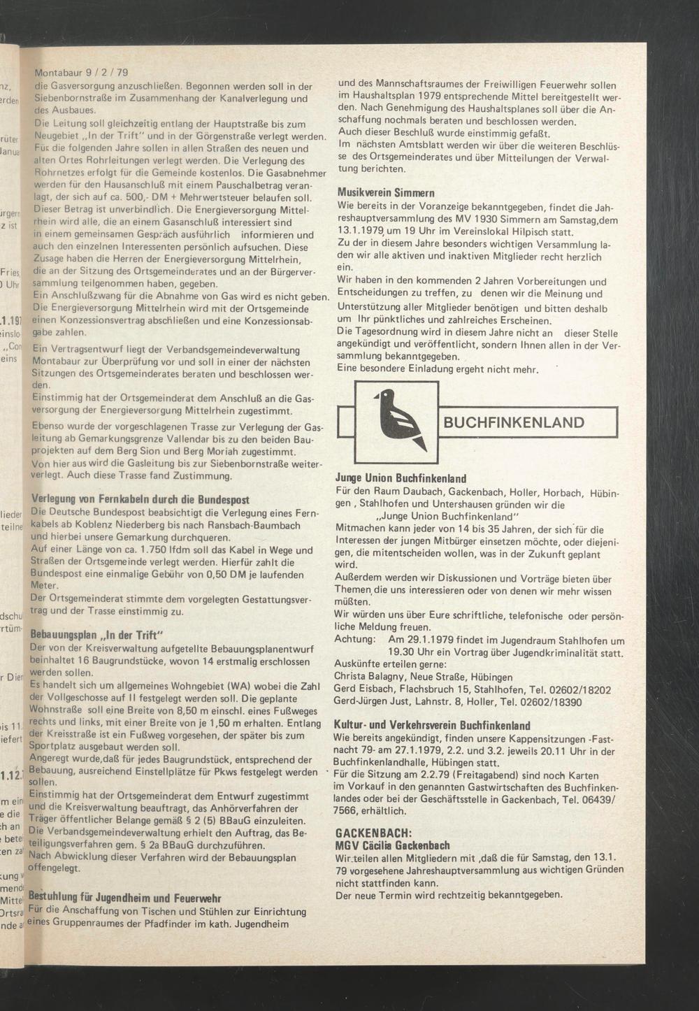 Für die Sitzung am 2.2.79 (Freitagabend) sind noch Karten im Vorkauf in den genannten Gastwirtschaften des Buchfinkenlandes oder bei der Geschäftsstelle in Gackenbach, Tel. 06439/ 7566, erhältlich.