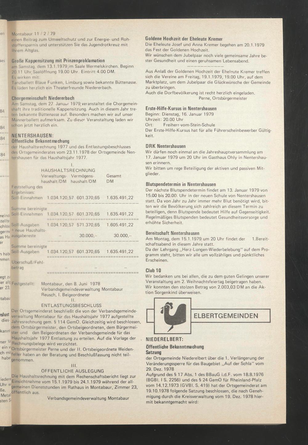 . Die Haushaltsrechnung mit dem Rechenschaftsbericht liegt zur i'fu er Einsichtnahme vom 15.1.1979 bis 24.1.1979 während der all- gemeinen Dienststunden im Rathaus in Montabaur, Zimmer 23, Metalllöffentüch aus.