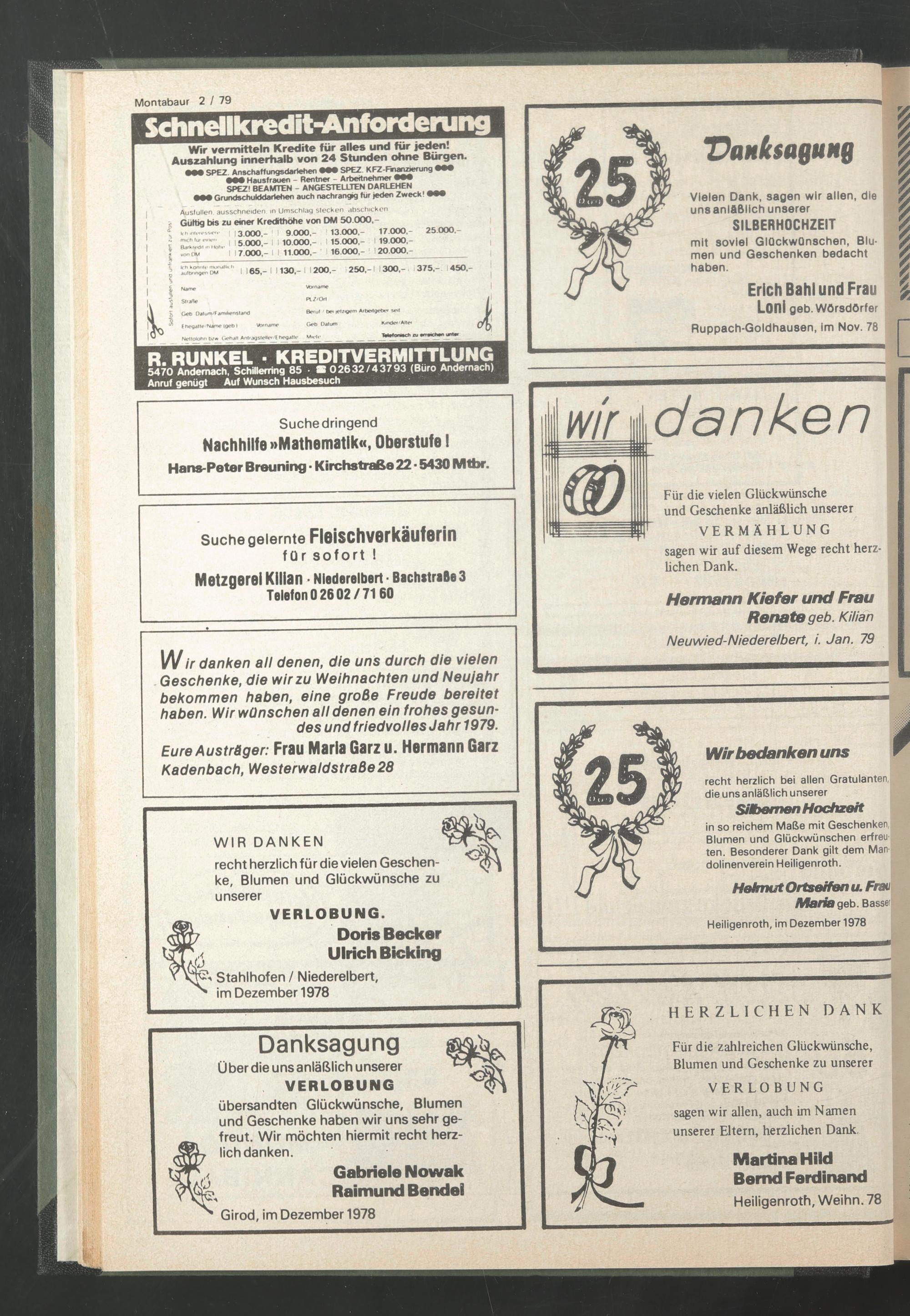 \Nir danken all denen, die uns durch die vielen Geschenke, die wir zu Weihnachten und Neujahr bekommen haben, eine große Freude bereitet haben. Wir wünschen all denen ein frohes gesundes und friedvolles Jahr 1979.