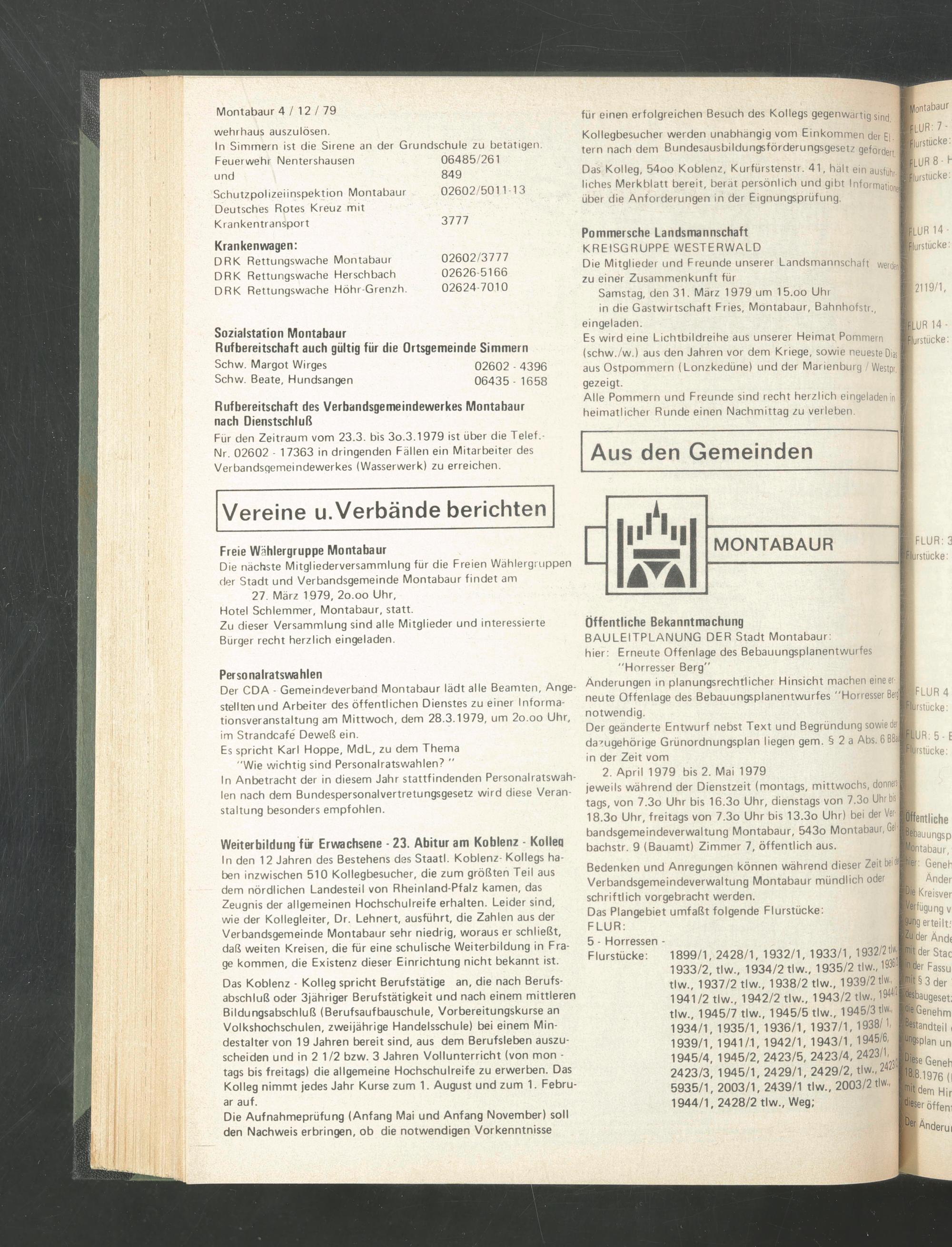 Für den Zeitraum vom 23.3. bis 3o.3.1979 ist über die Telef.- Nr. 02602 - 17363 in dringenden Fällen ein Mitarbeiter des Verbandsgemeindewerkes (Wasserwerk) zu erreichen.