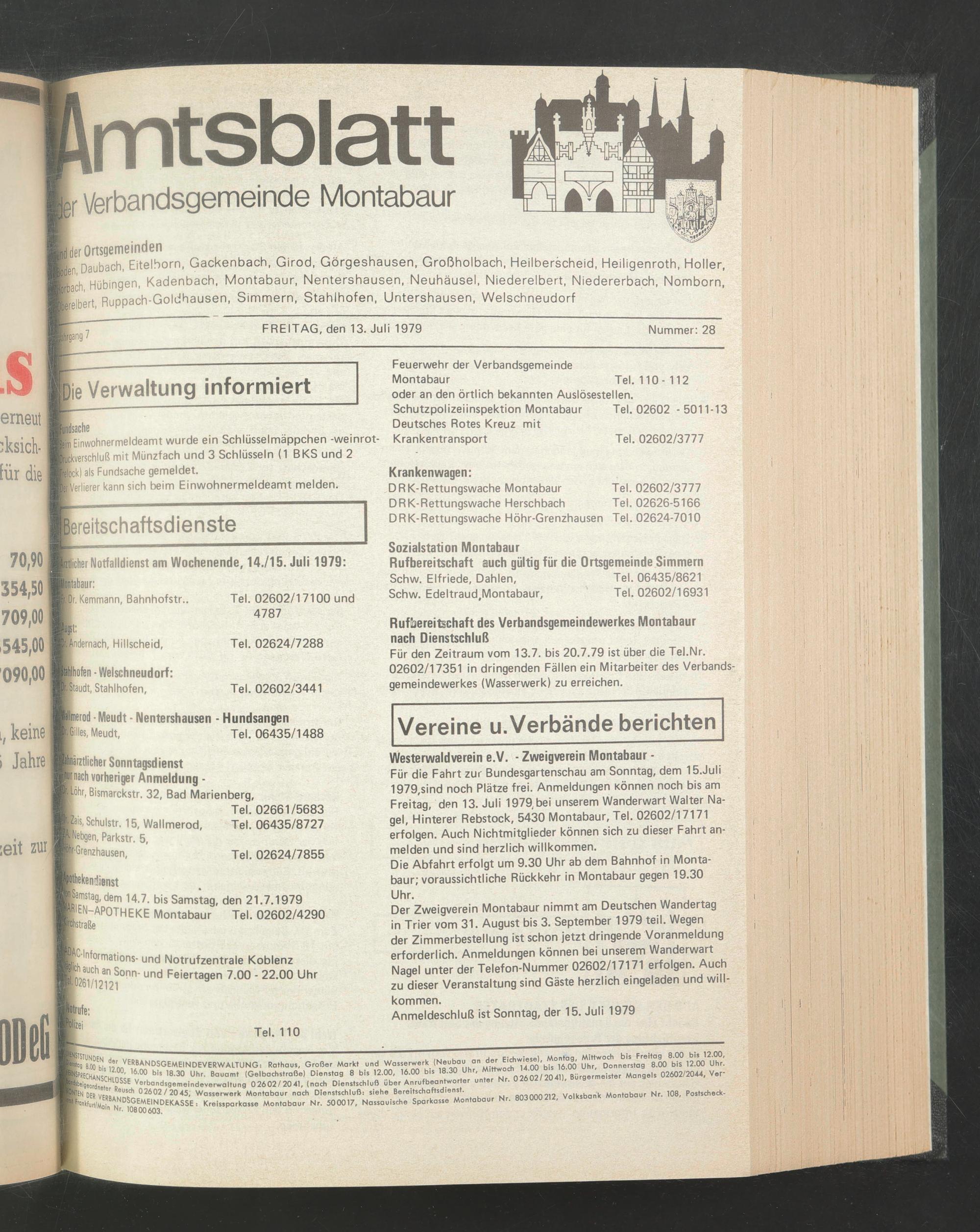 Für den Zeitraum vom 13.7. bis 20.7.79 ist über die Tel.Nr. 02602/17351 in dringenden Fällen ein Mitarbeiter des Verbandsgemeindewerkes (Wasserwerk) zu erreichen.
