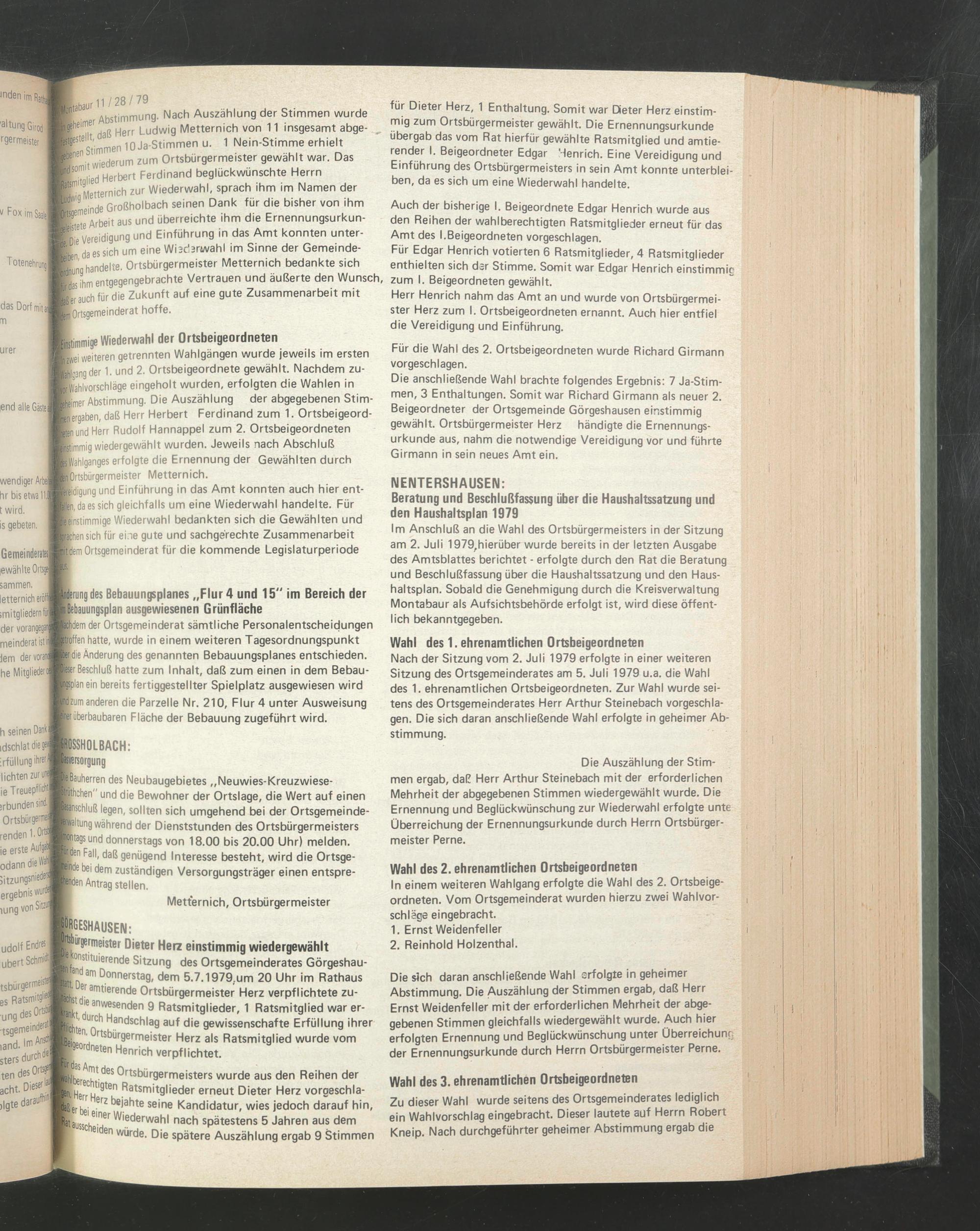 Nach der Sitzung vom 2. Juli 1979 erfolgte in einer weiteren Sitzung des Ortsgemeinderates am 5. Juli 1979 u.a. die Wahl des 1. ehrenamtlichen Ortsbeigeordneten. Zur Wahl wurde seitens des Ortsgemeinderates Herr Arthur Steinebach vorgeschlagen. Die sich daran anschließende Wahl erfolgte in geheimer Abstimmung.