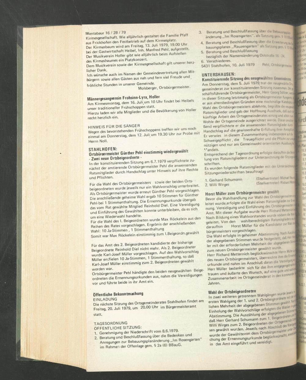 Die nächste Sitzung des Ortsgemeinderates Stahlhofen findet am Freitag, 20. Juli 1979, um 20.00 Uhr im Bürgermeisteramt statt.