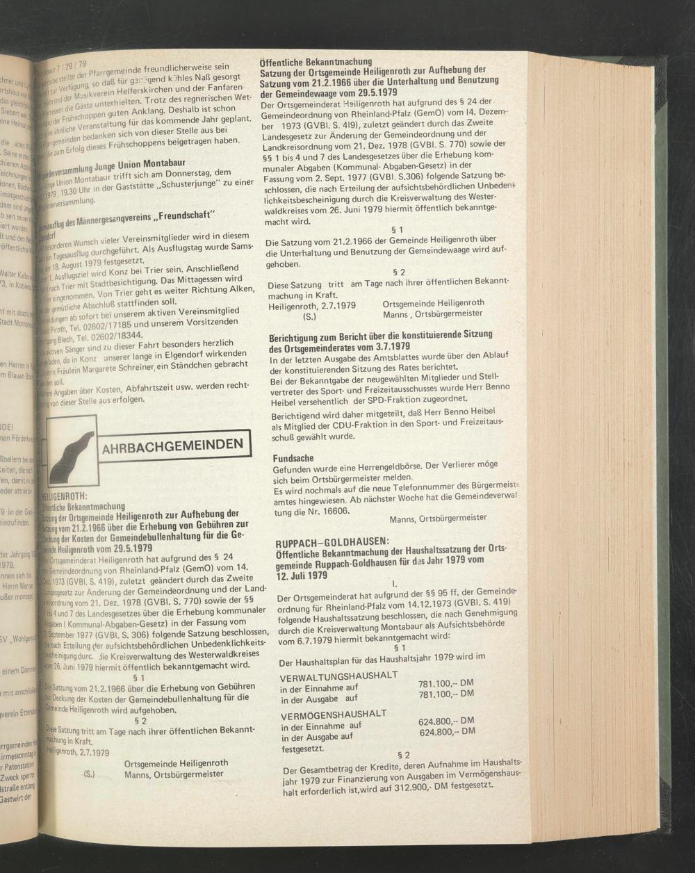 Öffentliche Bekanntmachung der Haushaltssatzung der Ortsgemeinde Ruppach-Goldhausen für das Jahr 1979 vom 12. Juli 1979