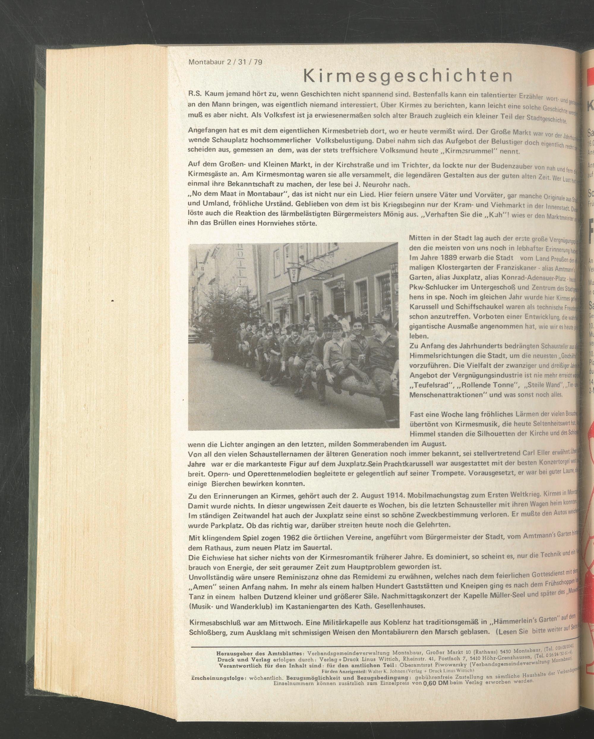 Zu den Erinnerungen an Kirmes, gehört auch der 2. August 1914. Mobilmachungstag zum Ersten Weltkrieg. Kirmes in Monte Damit wurde nichts. In dieser ungewissen Zeit dauerte es Wochen, bis die letzten Schausteller mit ihren Wagen heim konnttfl Im ständigen Zeitwandel hat auch der Juxplatz seine einst so schöne Zweckbestimmung verloren. Er mußte den Autos weiq wurde Parkplatz. Ob das richtig war, darüber streiten heute noch die Gelehrten.