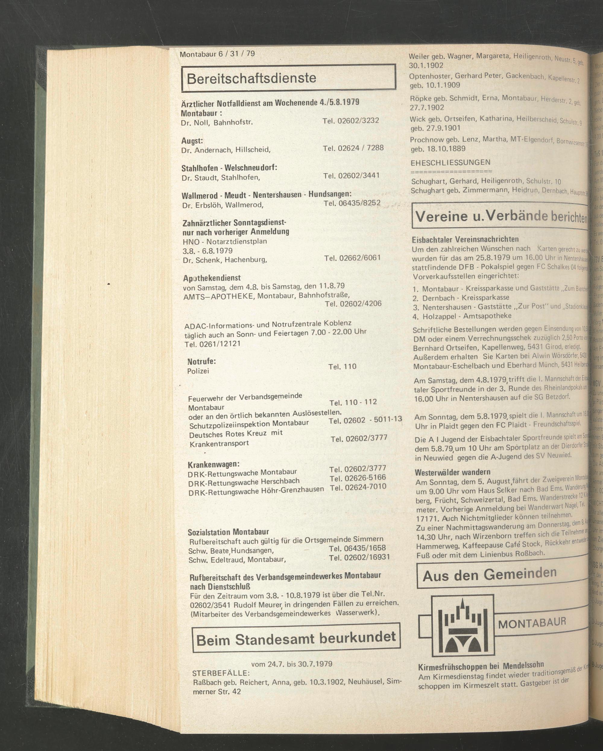 Ärztlicher Notfalldienst am Wochenende 4./5.8.1979 Montabaur: