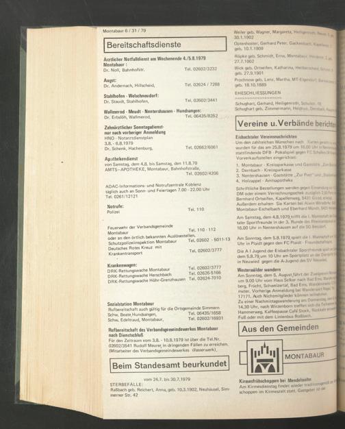 Für den Zeitraum vom 3.8. - 10.8.1979 ist über die Tel.Nr. 02602/3541 Rudolf Meurer, in dringenden Fällen zu erreichen. (Mitarbeiter des Verbandsgemeindewerkes Wasserwerk).
