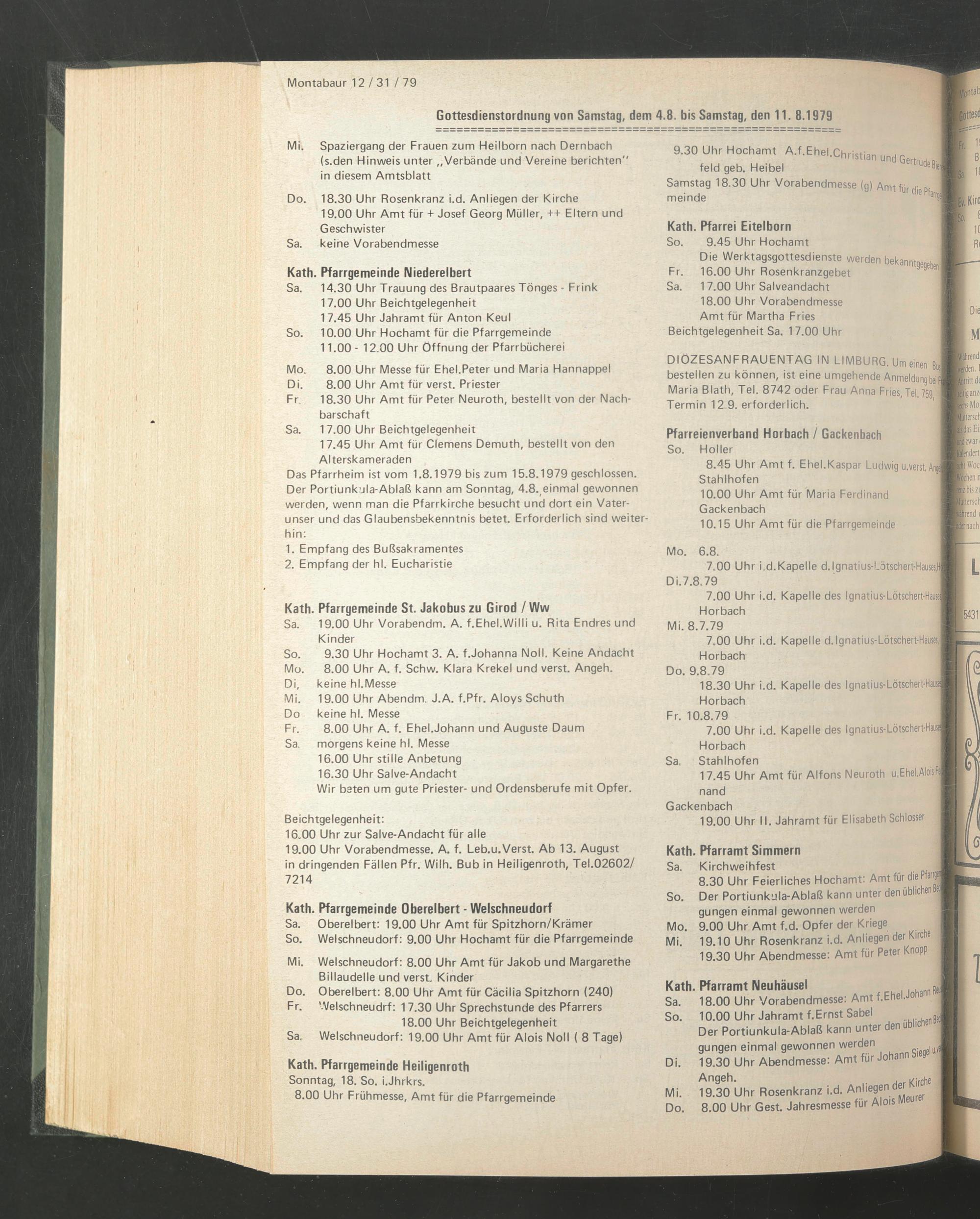 Das Pfarrheim ist vom 1.8.1979 bis zum 15.8.1979 geschlossen. Der Portiunkula-Ablaß kann am Sonntag, 4.8.einmal gewonnen werden, wenn man die Pfarrkirche besucht und dort ein Vaterunser und das Glaubensbekenntnis betet. Erforderlich sind weiterhin: