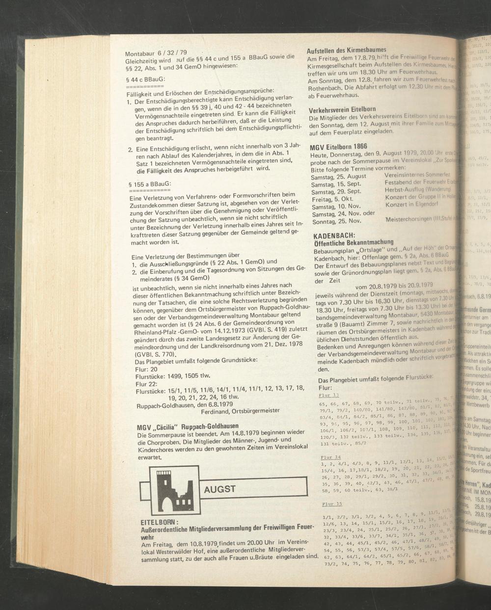 vom 20.8.1979 bis 20.9.1979 jeweils während der Dienstzeit (montags, mittwochs, doi tags von 7.30 Uhr bis 16.30 Uhr, dienstags von 7.30 Uhr 18.30 Uhr, freitags von 7.30 Uhr bis 13.30 Uhr) beider bandsgemeindeverwaltung Montabaur, 5430 Montabaur, Straße 9 (Bauamt) Zimmer 7, sowie nachrichtlich in den räumen des Ortsbürgermeisters in Kadenbach währendd üblichen Denststunden öffentlich aus.
