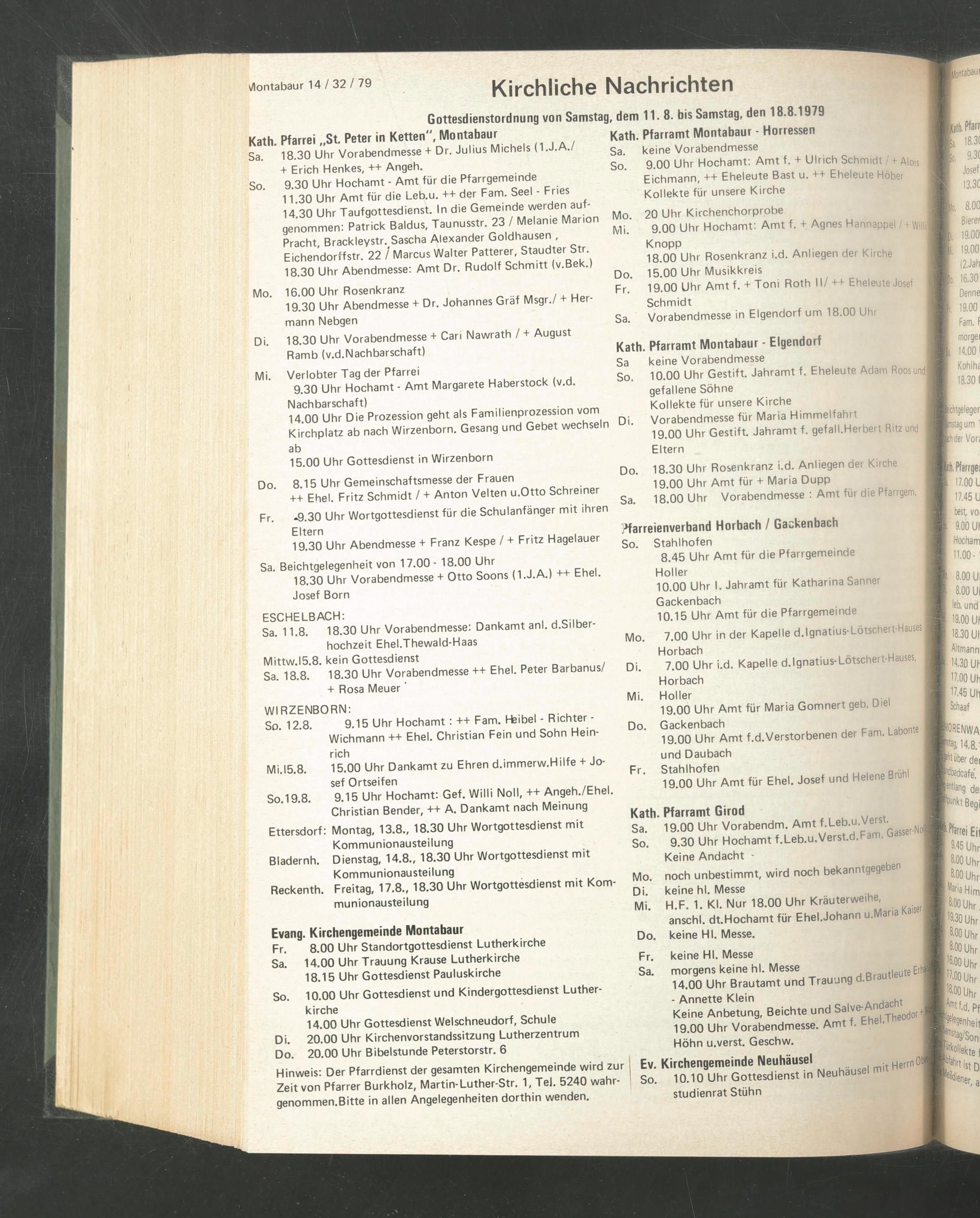 Gottesdienstordnung von Samstag, dem 11. 8. bis Samstag, den 18.8.1979