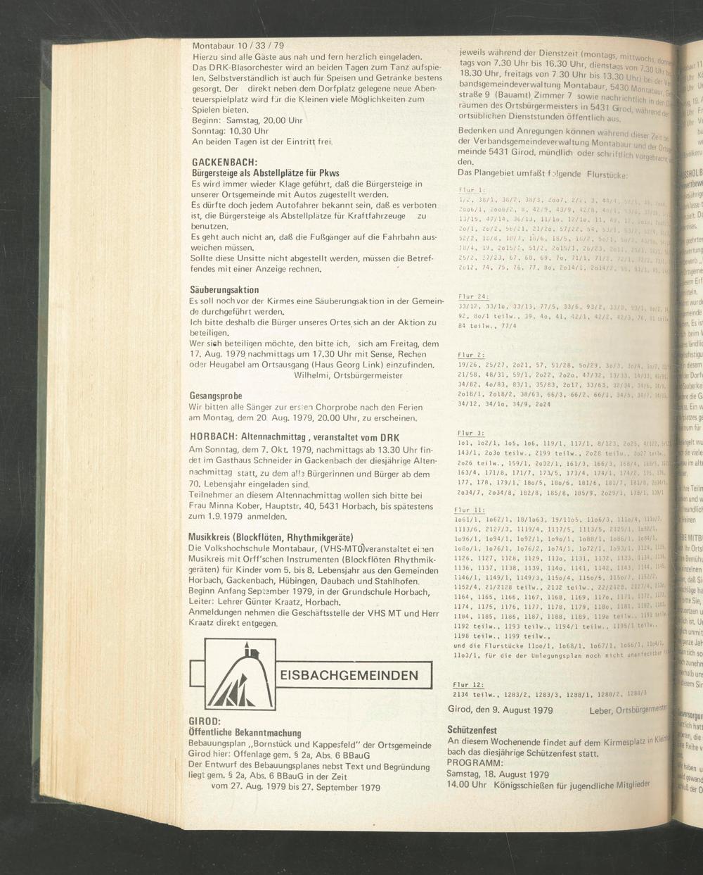 Wer sieh beteiligen möchte, den bitte ich, sich am Freitag, dem 17. Aug. 1979 nachmittags um 17.30 Uhr mit Sense, Rechen oder Heugabel am Ortsausgang (Haus Georg Link) einzufinden.