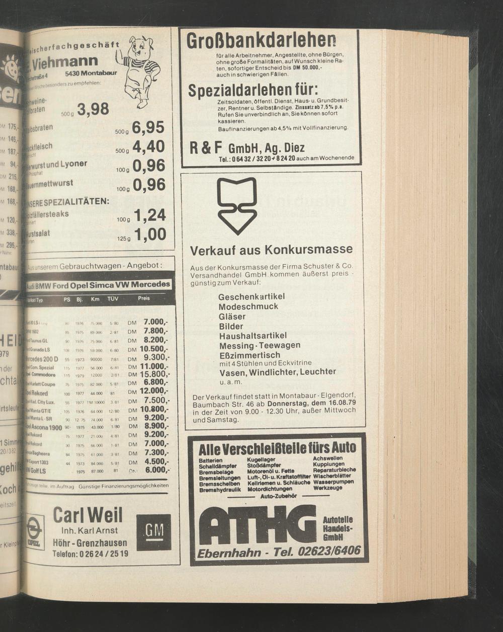 Der Verkauf findet statt in Montabaur - Eigendorf, Baumbach Str. 46 ab Donnerstag, dem 16.08.79 in der Zeit von 9.00 - 12.30 Uhr, außer Mittwoch und Samstag.