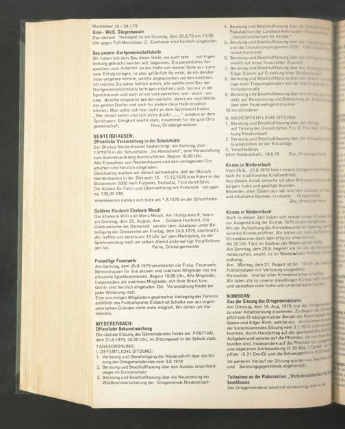 Die nächste Sitzung des Gemeinderates findet am FREITAG, dem 31.8.1979, 20.00 Uhr, im Sitzungssaal in der Schule statt.
