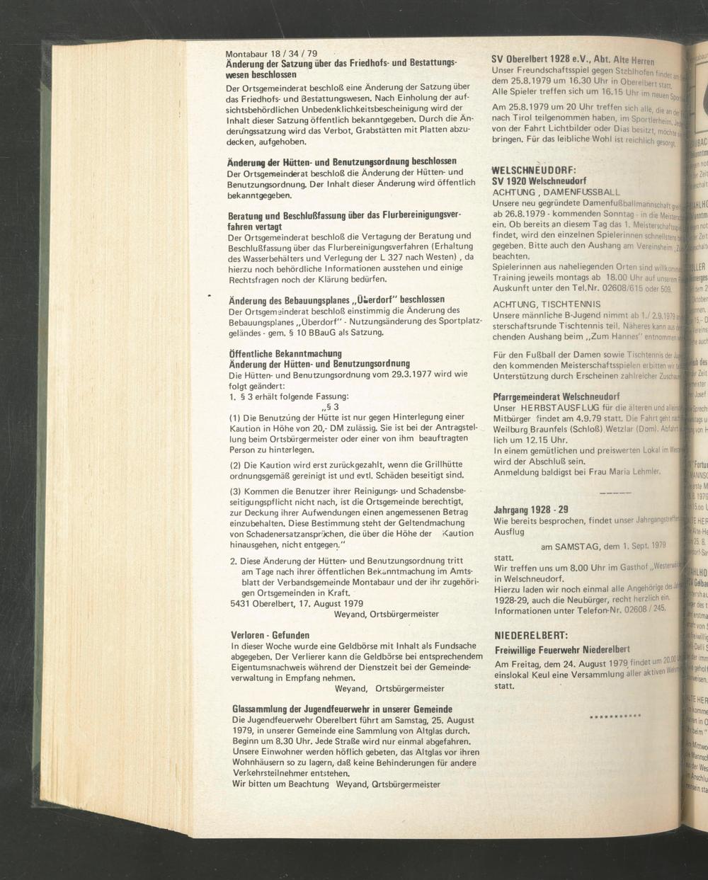 Die Jugendfeuerwehr Oberelbert führt am Samstag, 25. August 1979, in unserer Gemeinde eine Sammlung von Altglas durch. Beginn um 8.30 Uhr. Jede Straße wird nur einmal abgefahren. Unsere Einwohner werden höflich gebeten, das Altglas vor ihren Wohnhäusern so zu lagern, daß keine Behinderungen für andere Verkehrsteilnehmer entstehen.