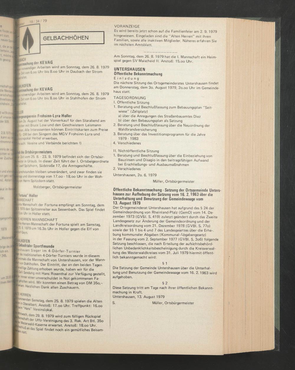 Die nächste Sitzung des Ortsgemeinderates Untershausen findet am Donnerstag, dem 3o. August 1979, 2o.oo Uhr im Gemeindehaus statt.