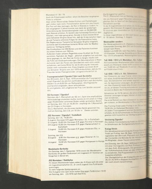 Am Mittwoch, dem 5. Sept. 1979 veranstaltet die Frauengemeinschaft Eigendorf die jährlich stattfindende Fahrt nach Bornhofen. Abfahrt ist um 8.00 Uhr am Rathausplatz. Alle Elgendorfer sind herzlich eingeladen, daran teilzunehmen.