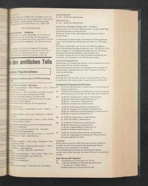 Wir bitten zu überlegen, wer für den neun PGR kandidieren sollte. Kandidatenvorschläge müssen bis zum 7.10.1979 im Pfarr- büro vorliegen. Ein Kandidatenvorschlag muß von 10 wahlberechtigten Gemeindemitgliedern unterschrieben sein.