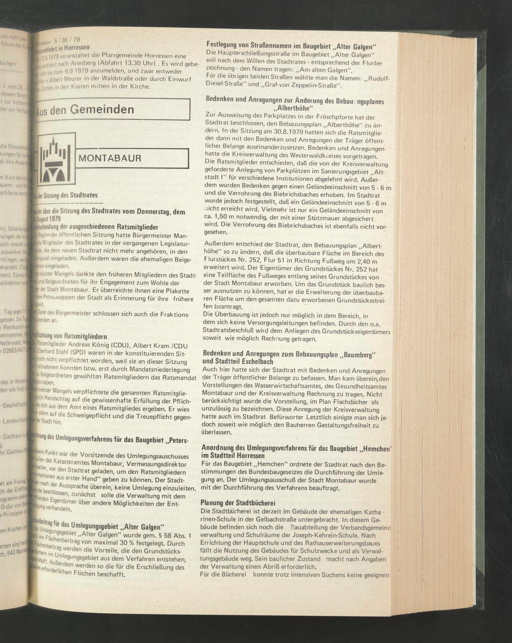 Für das Baugebiet „Hemchen" ordnete der Stadtrat nach den Bestimmungen des Bundesbaugesetzes die Durchführung der Umlegung an. Der Umlegungsausschuß der Stadt Montabaur wurde mit der Durchführung des Verfahrens beauftragt