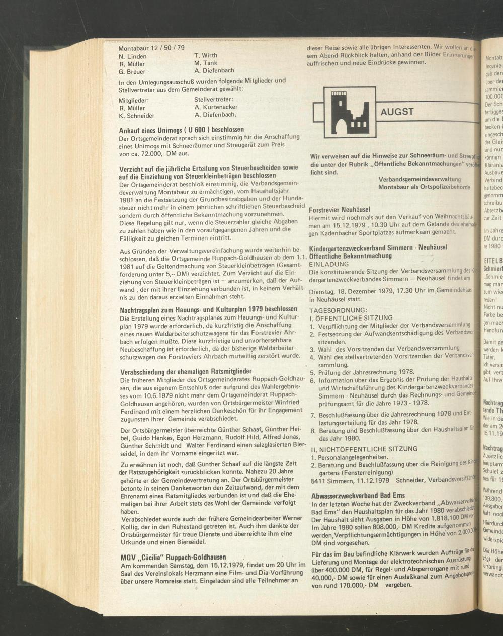 Der Ortsgemeinderat sprach sich einstimmig für die Anschaffung eines Unimogs mit Schneeräumer und Streugerät zum Preis von ca. 72.000,- DM aus.