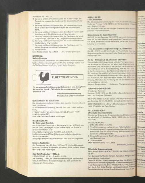 Die Jahreshauptversammlung der Freiw. Feuerwehr Oberelbert; findet am Freitag, 14.12.1979 in der Dorfgaststätte Pilgenrö statt. Beginn : 20 Uhr.