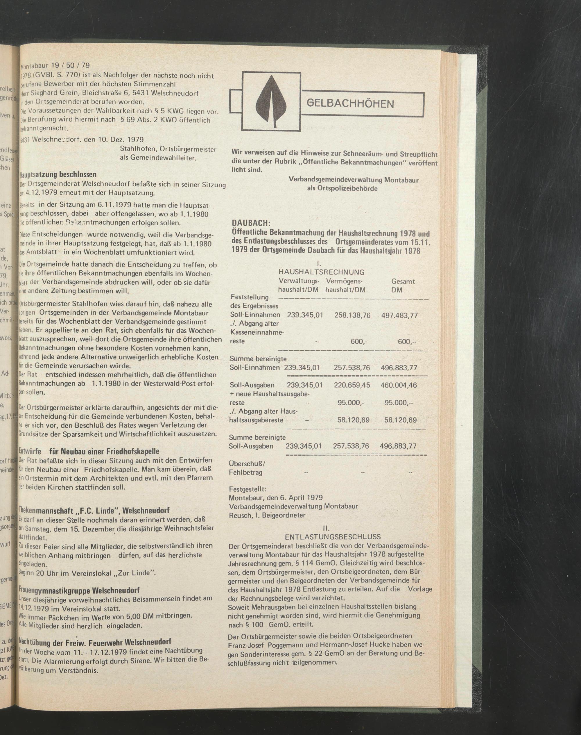 Öffentliche Bekanntmachung der Haushaltsrechnung 1978 und des Entlastungsbeschlusses des Ortsgemeinderates vom 15.11. 1979 der Ortsgemeinde Daubach für das Haushaltsjahr 1978