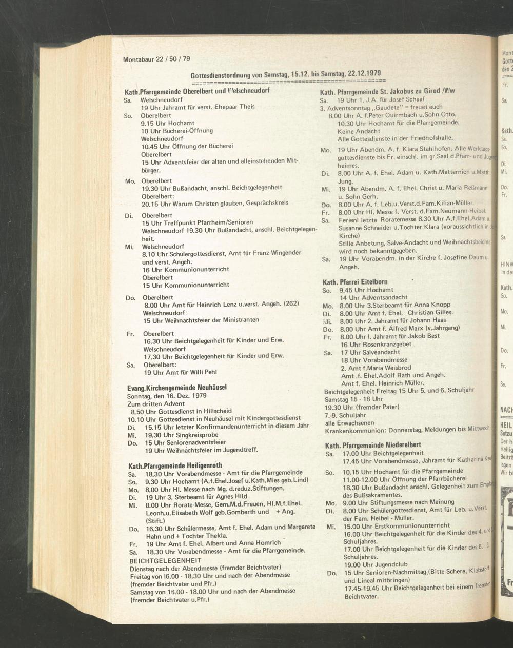 Gottesdienstordnung von Samstag, 15.12. bis Samstag, 22.12.1979