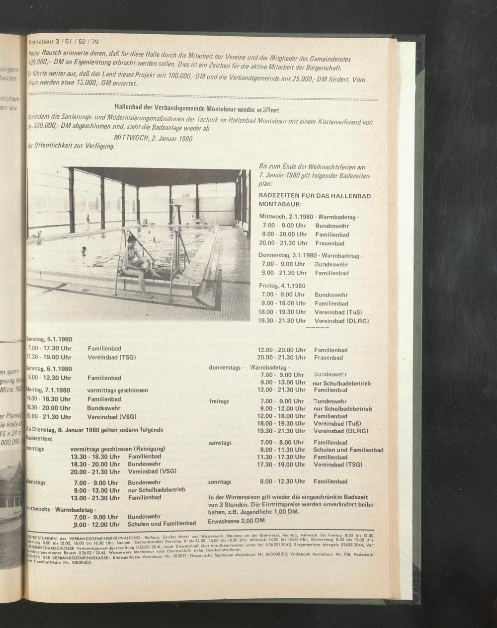 Bis zum Ende der Weihnachtsferien am 7. Januar 1980 gilt folgender Badezeitenplan:
