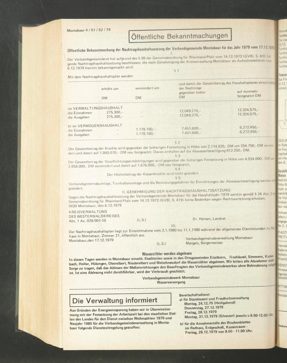 Der Nachtragshaushaltsplan liegt zur Einsichtnahme vom 2.1.1980 bis 11.1.1980 während der allgemeinen Dienststunden im Rat-| haus in Montabaur, Zimmer 21, öffentlich aus.