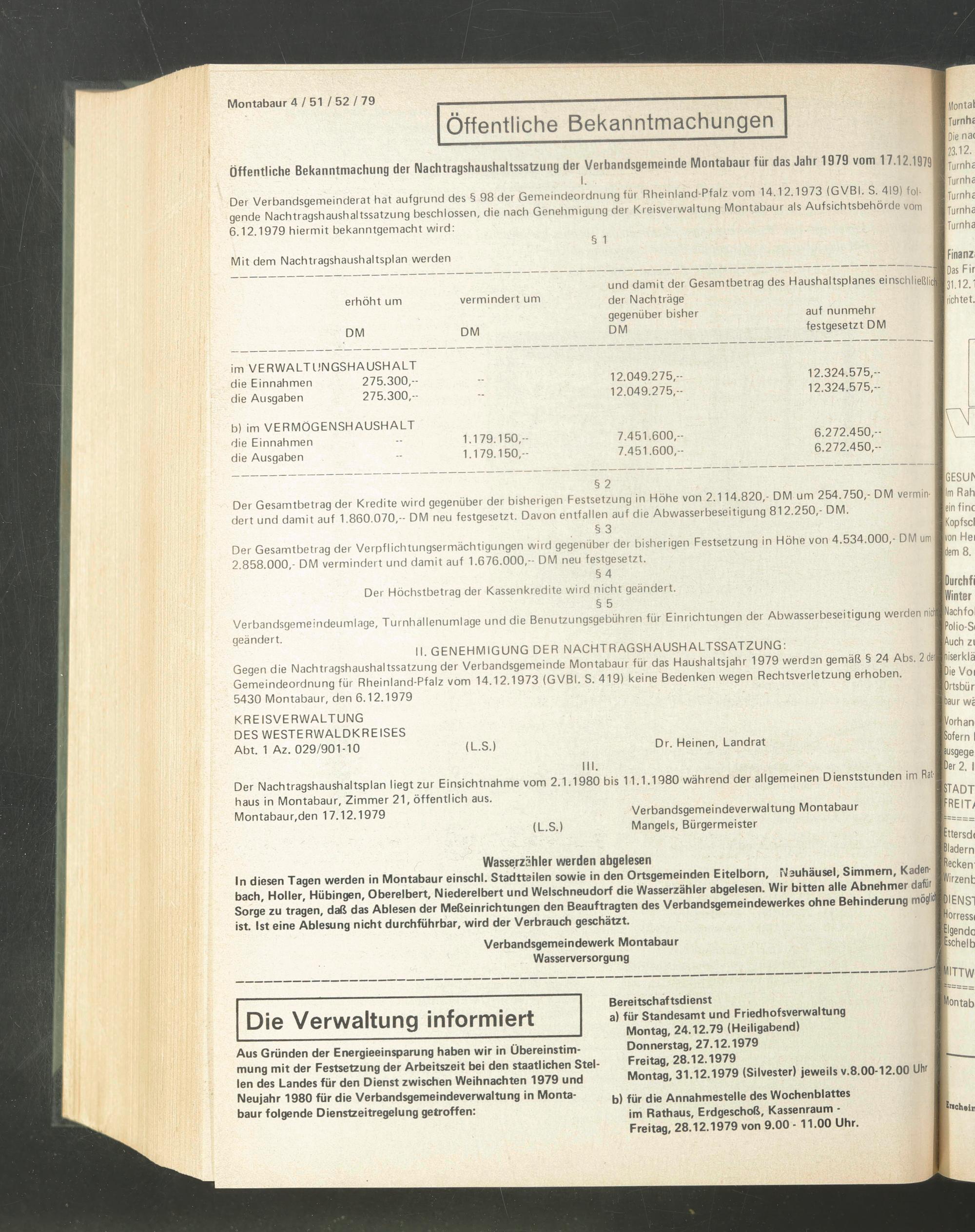 Aus Gründen der Energieeinsparung haben wir in Übereinstimmung mit der Festsetzung der Arbeitszeit bei den staatlichen Stellen des Landes für den Dienst zwischen Weihnachten 1979 und Neujahr 1980 für die Verbandsgemeindeverwaltung in Montabaur folgende Dienstzeitregelung getroffen: