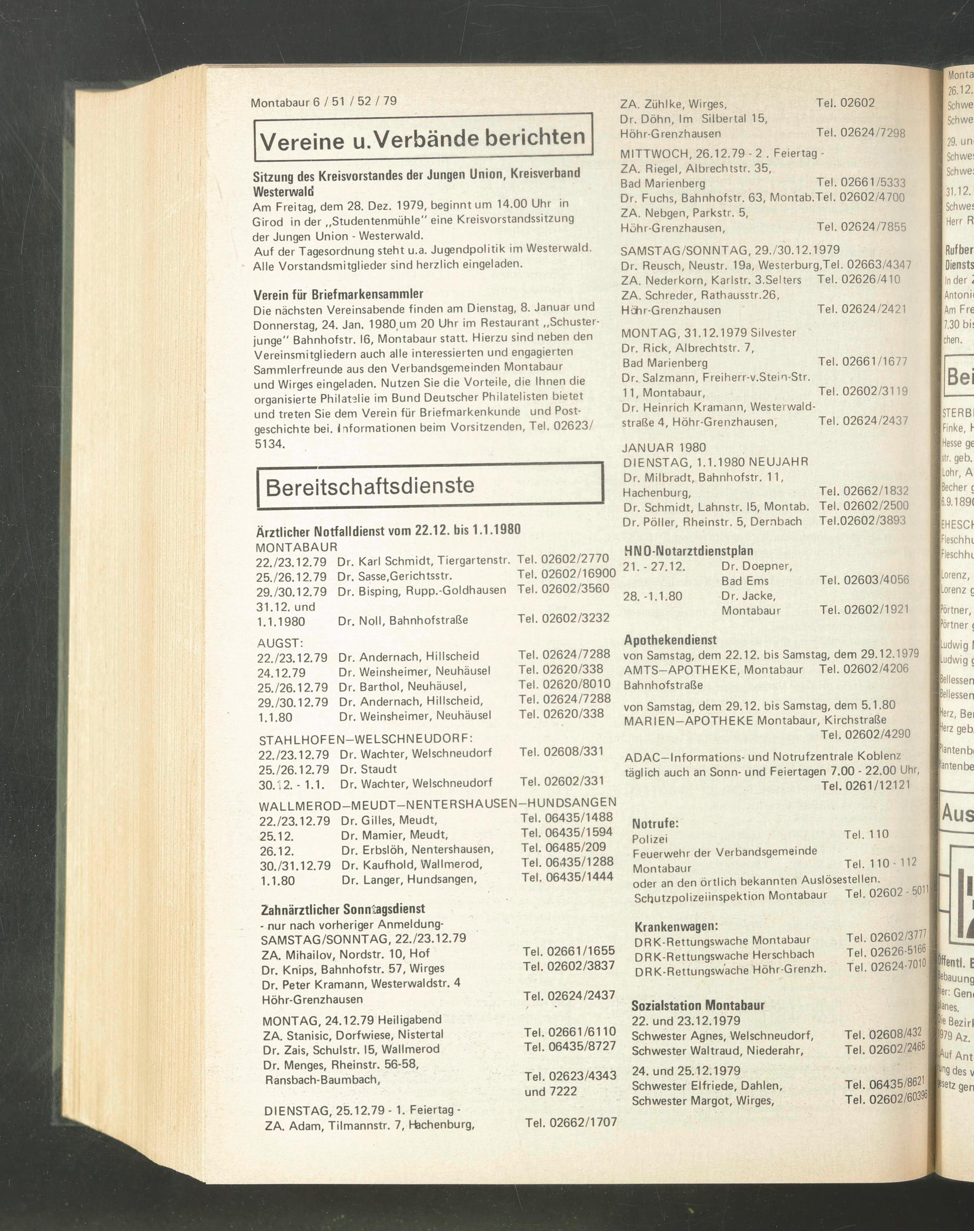 SAMSTAG/SONNTAG, 29730.12.1979 Dr. Reusch, Neustr. 19a, Westerburg,Tel. 02663/4347 ZA. Nederkorn, Karlstr. 3.Selters Tel. 02626/410 ZA. Schreder, Rathausstr.26,