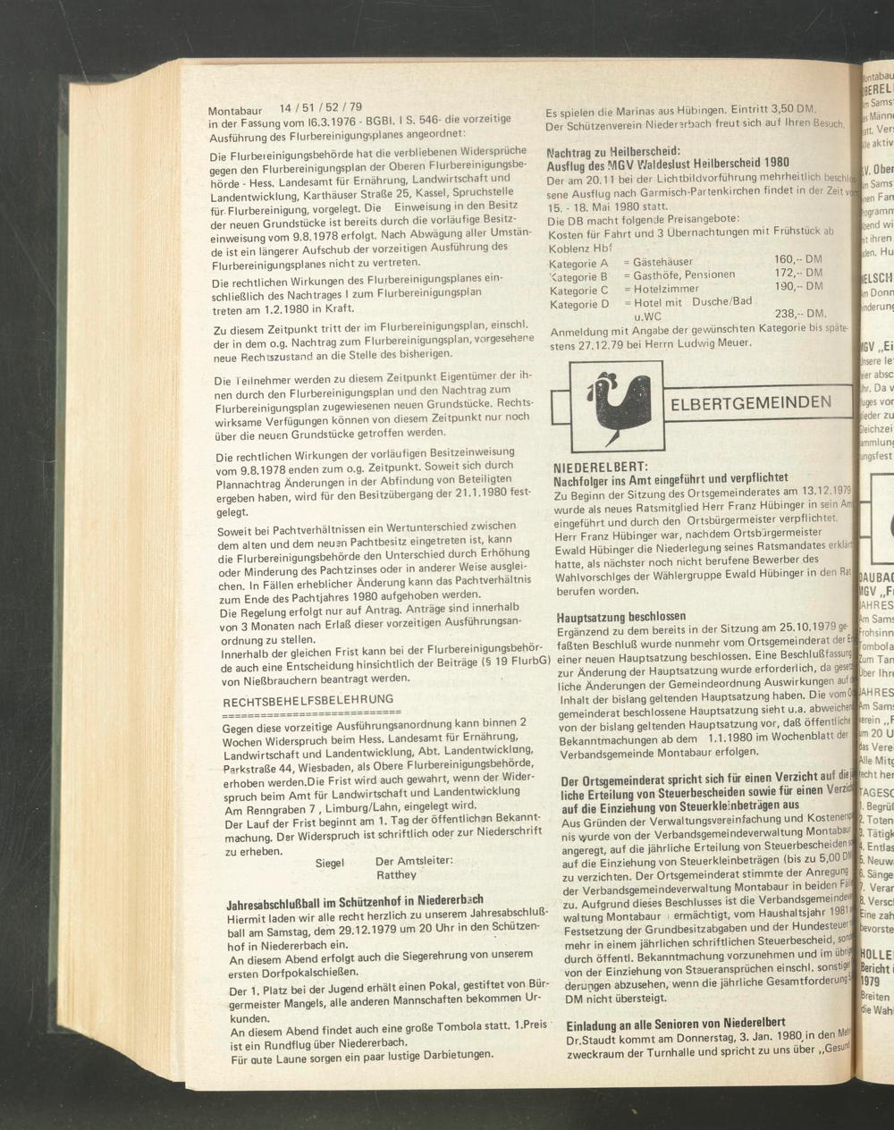 Zu Beginn der Sitzung des Ortsgemeinderates am 13.12.1979 wurde als neues Ratsmitglied Herr Franz Hübinger in sein Am] eingeführt und durch den Ortsbürgermeister verpflichtet. Herr Franz Hübinger war, nachdem Ortsb'irgermeister Ewald Hübinger die Niederlegung seines Ratsmandates erklär hatte, als nächster noch nicht berufene Bewerber des Wahlvorschlges der Wählergruppe Ewald Hübinger in den Rat berufen worden.