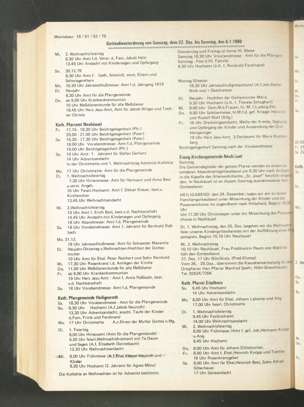 Gottesdienstordnung von Samstag, dem 22. Oez. bis Sonntag, den 6.1.1980