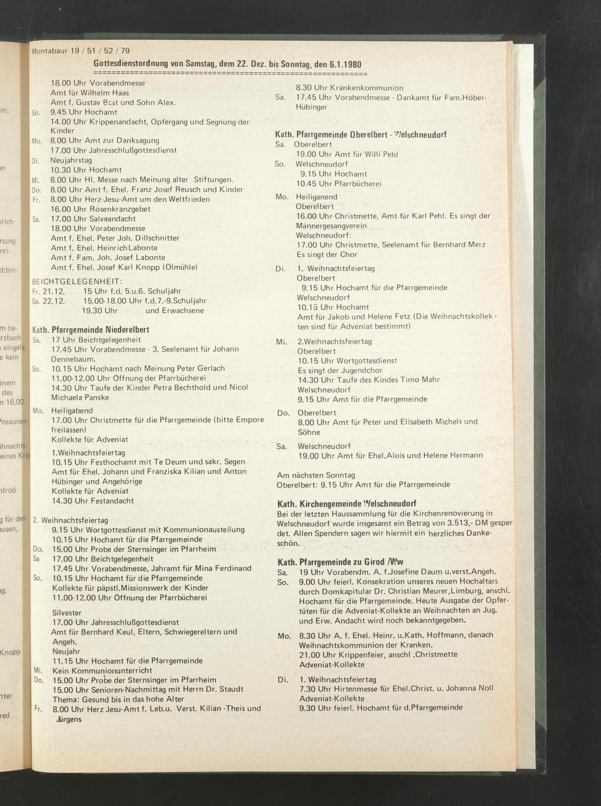 V Gottesdienstordnung von Samstag, dem 22. Dez. bis Sonntag, den 6.1.1980